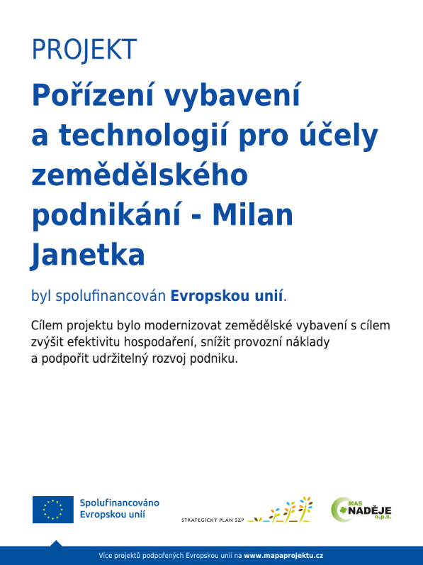 V rámci projektu realizovaného s podporou MAS Naděje o.p.s. a financovaného prostřednictvím Státního zemědělského intervenčního fondu ČR (12. výzva MAS Naděje SZP 1, Intervence 52.77) jsem pořídil moderní techniku pro sklizeň pícnin: